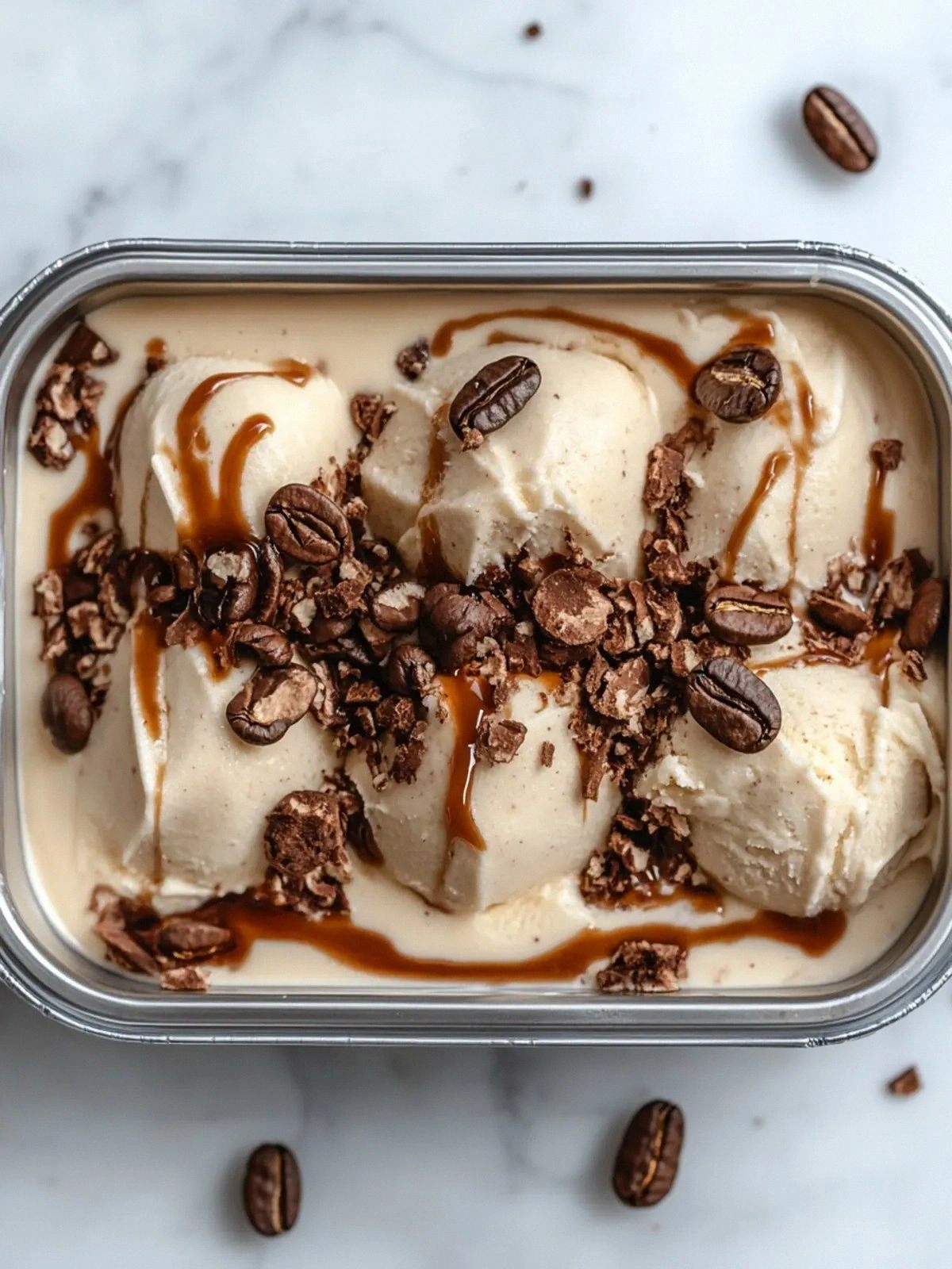 - After the final stir, fold in the crumpled pecan pralines and chocolate‑covered espresso beans. These additions should be incorporated gently to avoid breaking the beans.