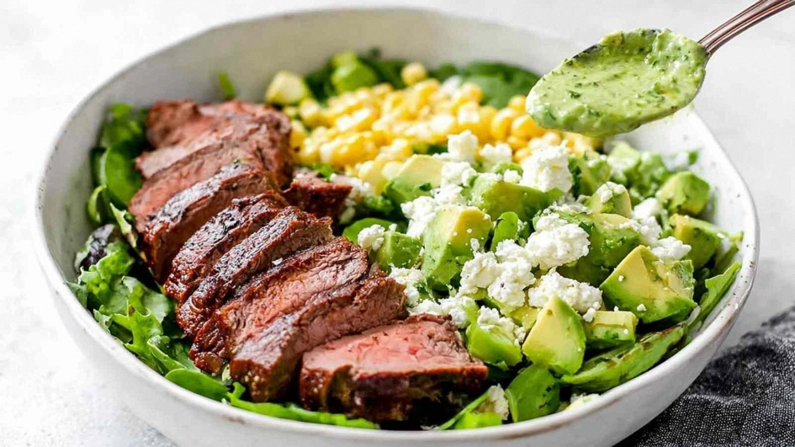 The first time I tasted it, I felt like I’d discovered a secret. The steak was perfectly seared, with a caramelized crust that sang a smoky note. The avocado was creamy but not greasy, and it held its shape against the heat. The corn kernels were bright and sweet, and the feta added a salty punch. The green goddess dressing was silky, with a hint of citrus that lifted everything. The jalapeños added just enough heat to keep the dish from feeling too heavy. The romaine lettuce was crisp, not wilted, providing a satisfying crunch. I was honestly surprised by how simple the ingredients were, yet the flavor was complex and layered. It’s the kind of dish that feels like a celebration, even when you’re just making lunch. This is why I’ve never been able to get enough of it.